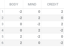 To find your character's attributes, roll 1d6 or choose a row and take the entire row.